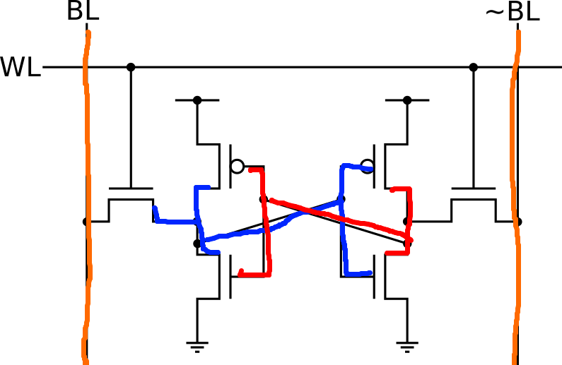 WLはメモリセル自体を選択するためのものです。メモリセルに書き込んだり、メモリセルからデータを読み出すタイミングでこのWLがHighになります。メモリとして動作する場合、基本的にアドレスのデコーダに接続されています。BLはデータそのものが流れる回路です。メモリセルはインバータなのでBLと反転した〜BLの二本が存在し、差動で動作します。単純な構造のSRAMではSRAMではビットラインを介してデータの読み込みと書き込みの両方が行われますが、デュアルポートSRAMなどでは、別に読み出し用のトランジスタが設置される場合もあります。