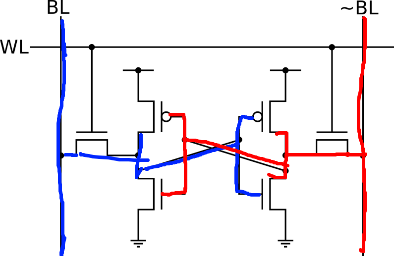 SRAMの書き込みは読み出しに比べると非常に簡単な操作です。読み書きを行いたいメモリセルのワード線に電圧を印加した上で、BLに書き込みたいデータの電圧を印加して、クロスカップルドラッチの状態を無理やり書き換えるだけです。図3にデータ書き込み時の電圧の印加の様子を示します。赤く塗られている線は電圧がHigh、青く塗られている線は電圧がLow電圧が印加されています。 この図の場合ですとBLがLow、~BLがHighが印加されていますので、書き込まれているデータは0になりますね。 このような電圧が印加されると、安定しているクロスカップルドラッチの状態が無理やり書き換えられることになります。最初に見たときはなかなかびっくりしましたが、非常に少ないトランジスタで必要な機能を実現できている面白い方法だと思います。